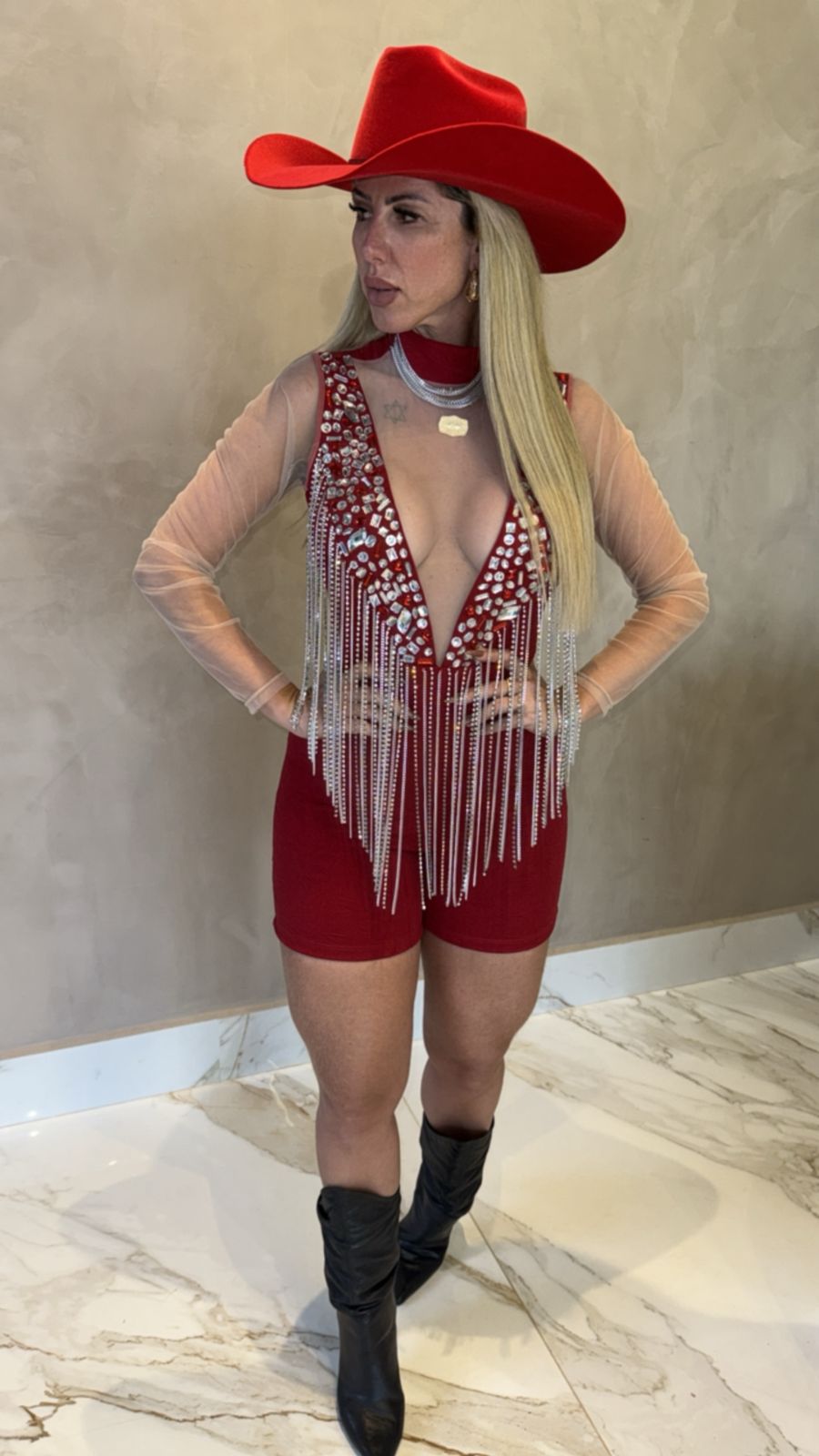 Macaquinho pedraria disponivel na cor vermelha no tamanho G.